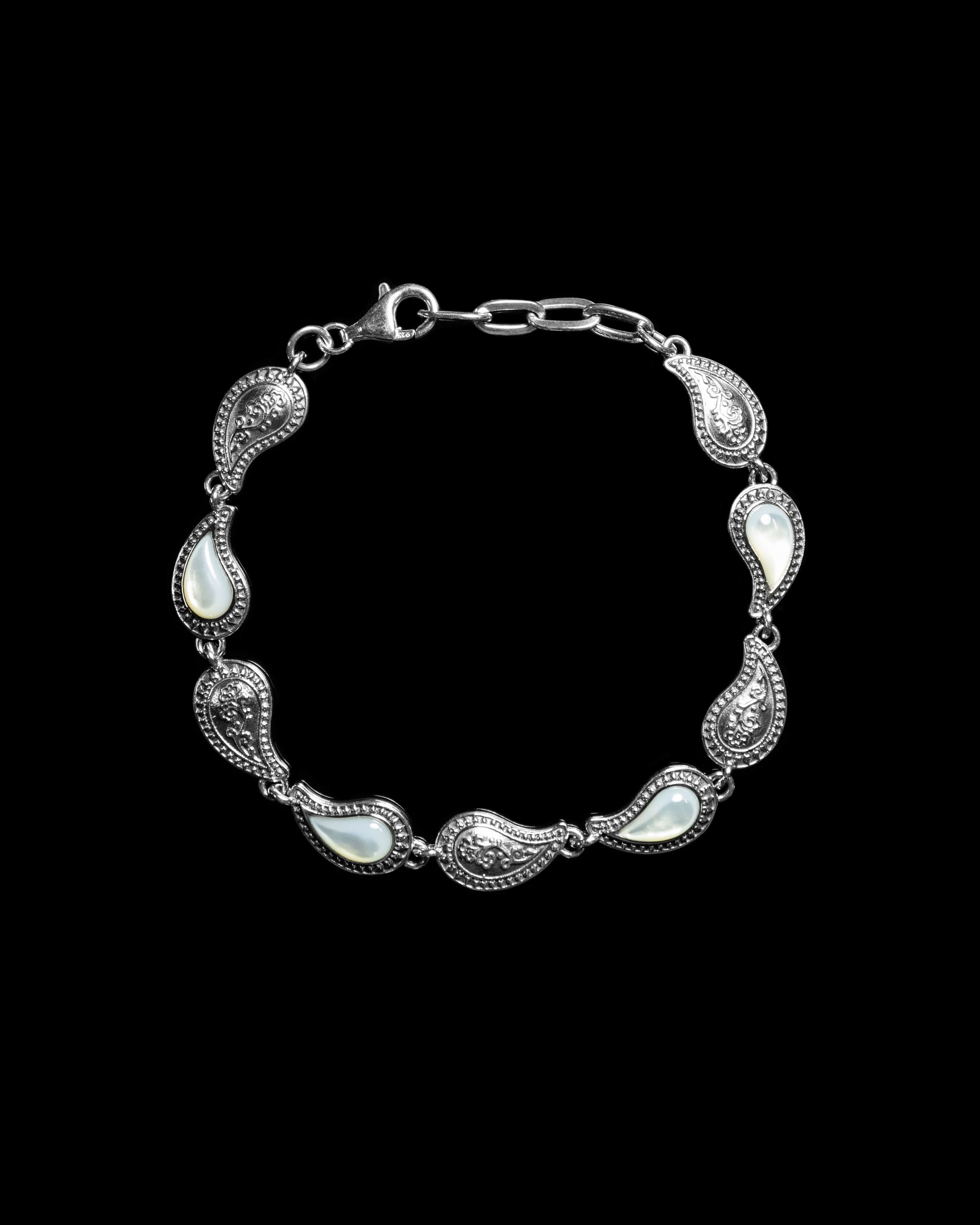 Handcrafted from 925 sterling silver, the Paisley Repeating Inlay Pearl Bracelet brings refined elegance to our best-selling Paisley collection. Each paisley link is carefully carved and inlaid with luminous mother of pearl, creating a timeless balance of detail and sophistication. Designed with a custom clasp and an adjustable fit from 7–8", this bracelet is made to be worn daily and treasured for a lifetime.