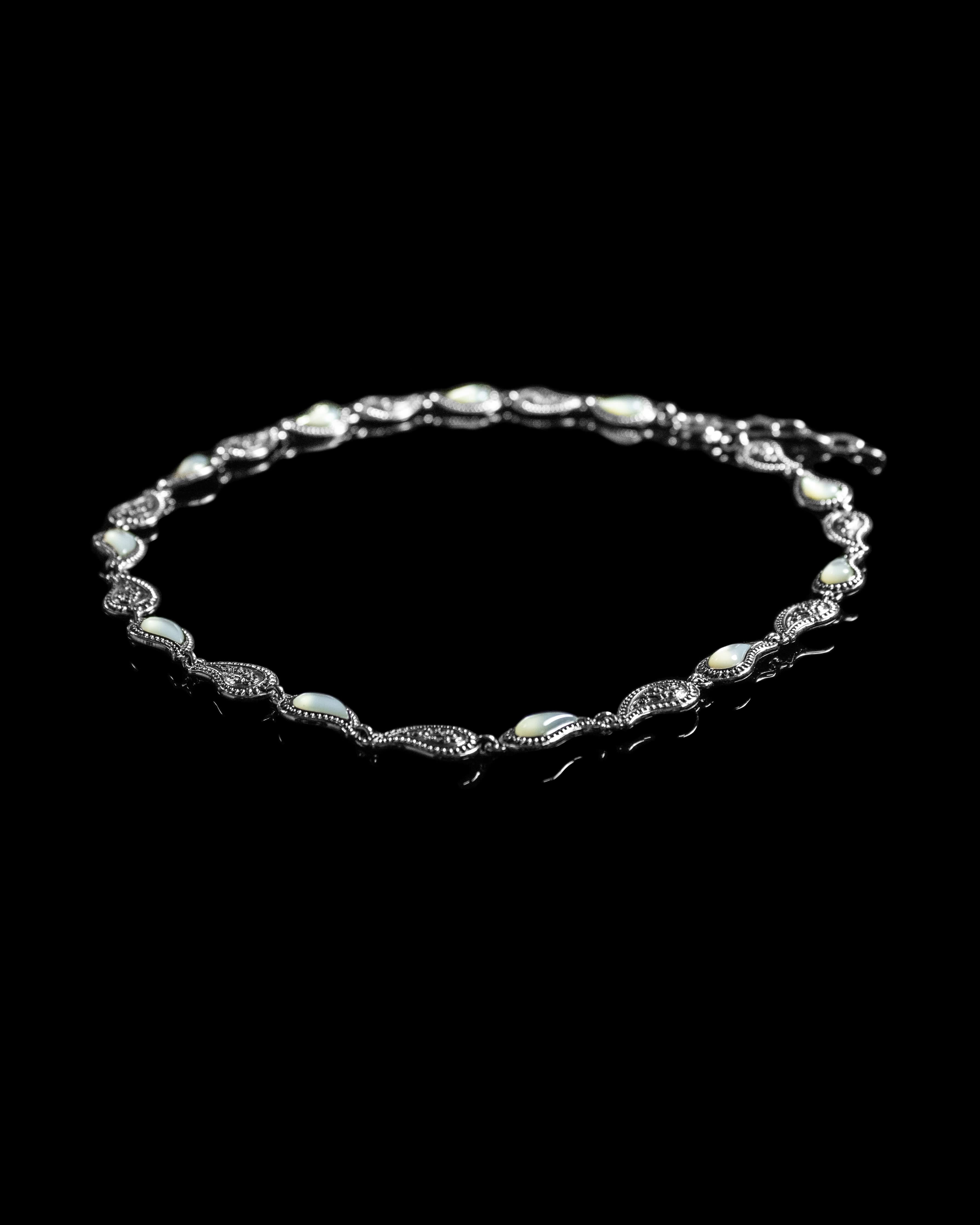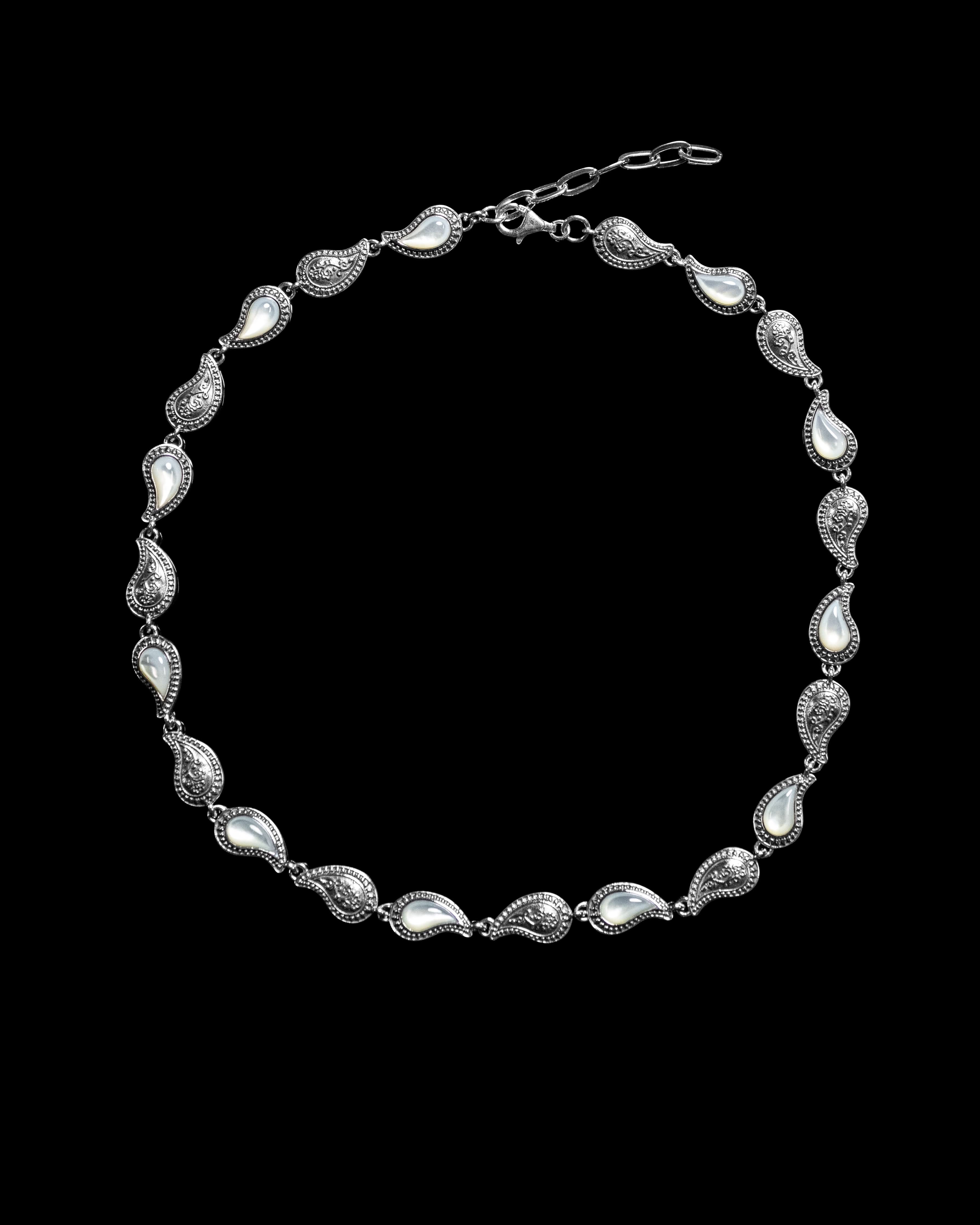 Handcrafted from 925 sterling silver, the Paisley Repeating Inlay Pearl Necklace is a striking new addition to our best-selling Paisley collection. Featuring luminous mother of pearl inlays set into a repeating paisley pattern, this piece captures light beautifully with every angle. Finished with a custom clasp and designed for versatility, the necklace is fully adjustable from 18–20", making it perfect for layering or wearing solo as a statement piece.
