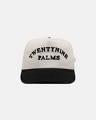 The 29 Palms Hat is a premium take on a classic trucker, cut and sewn from scratch for unmatched quality and fit. Designed with custom embellishments, this hat features laser-cut felt letters that spell out Twentynine Palms, each one hand-sewn to the front for a bold, elevated look. Inside, logo taping adds an extra level of detail, reinforcing the craftsmanship that sets this hat apart. With a 3.5” crown height and an adjustable snapback closure, it offers a perfect fit and all-day comfort.