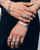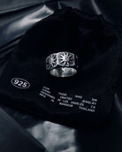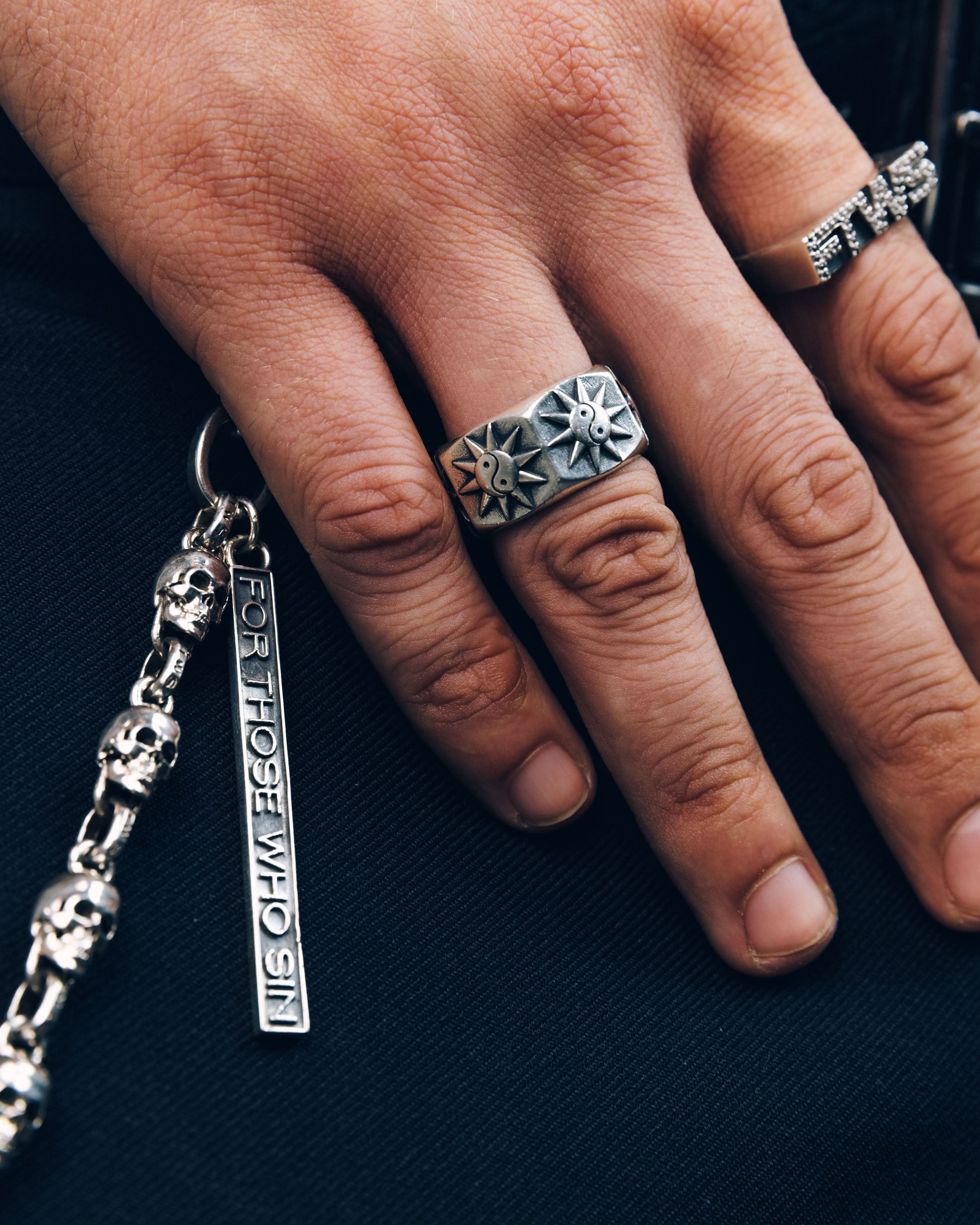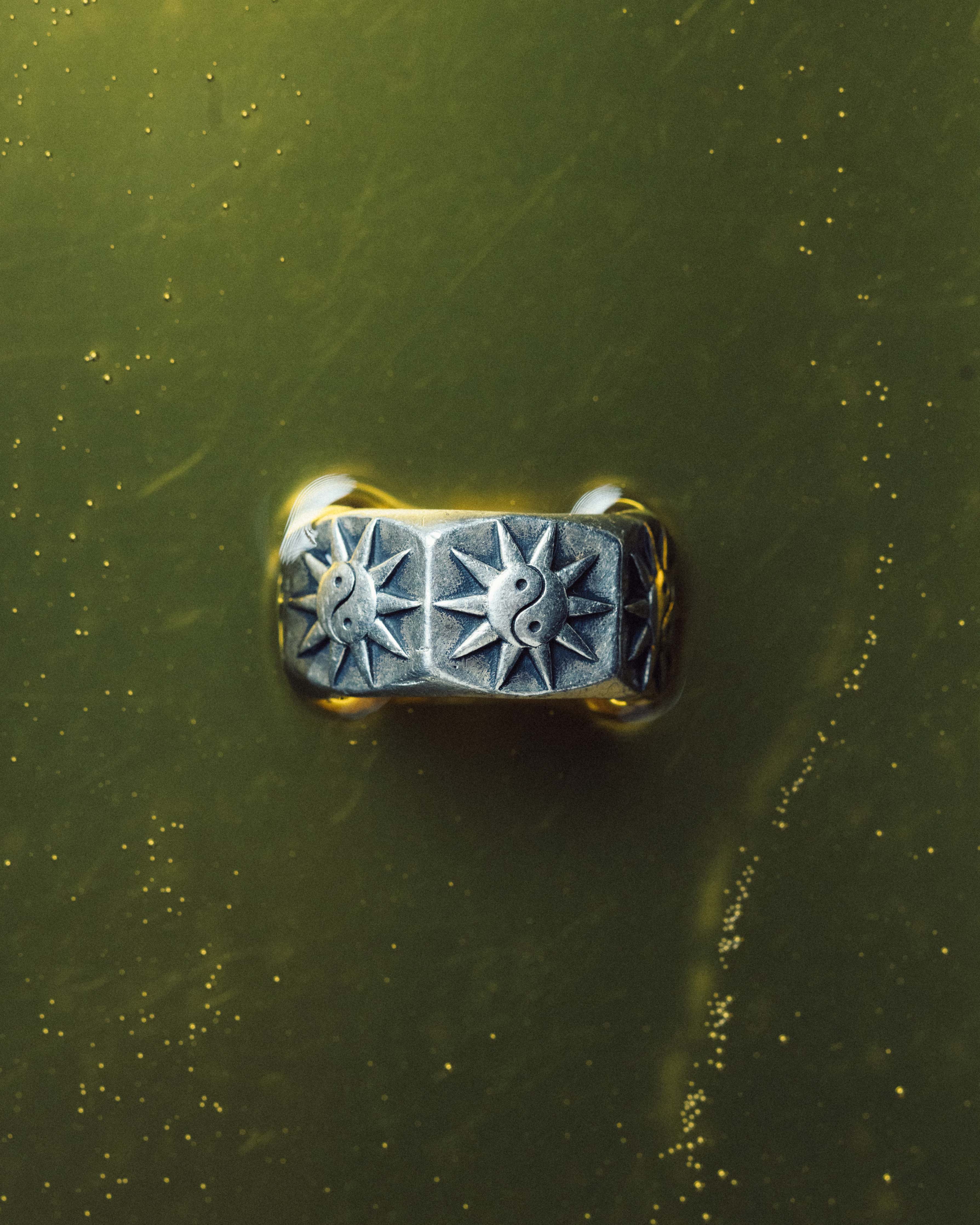 925 sterling silver, heavy-cast. Yin Yang Spur logo debossed on all six faces. Deep oxidation for that perfectly worn look.