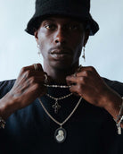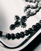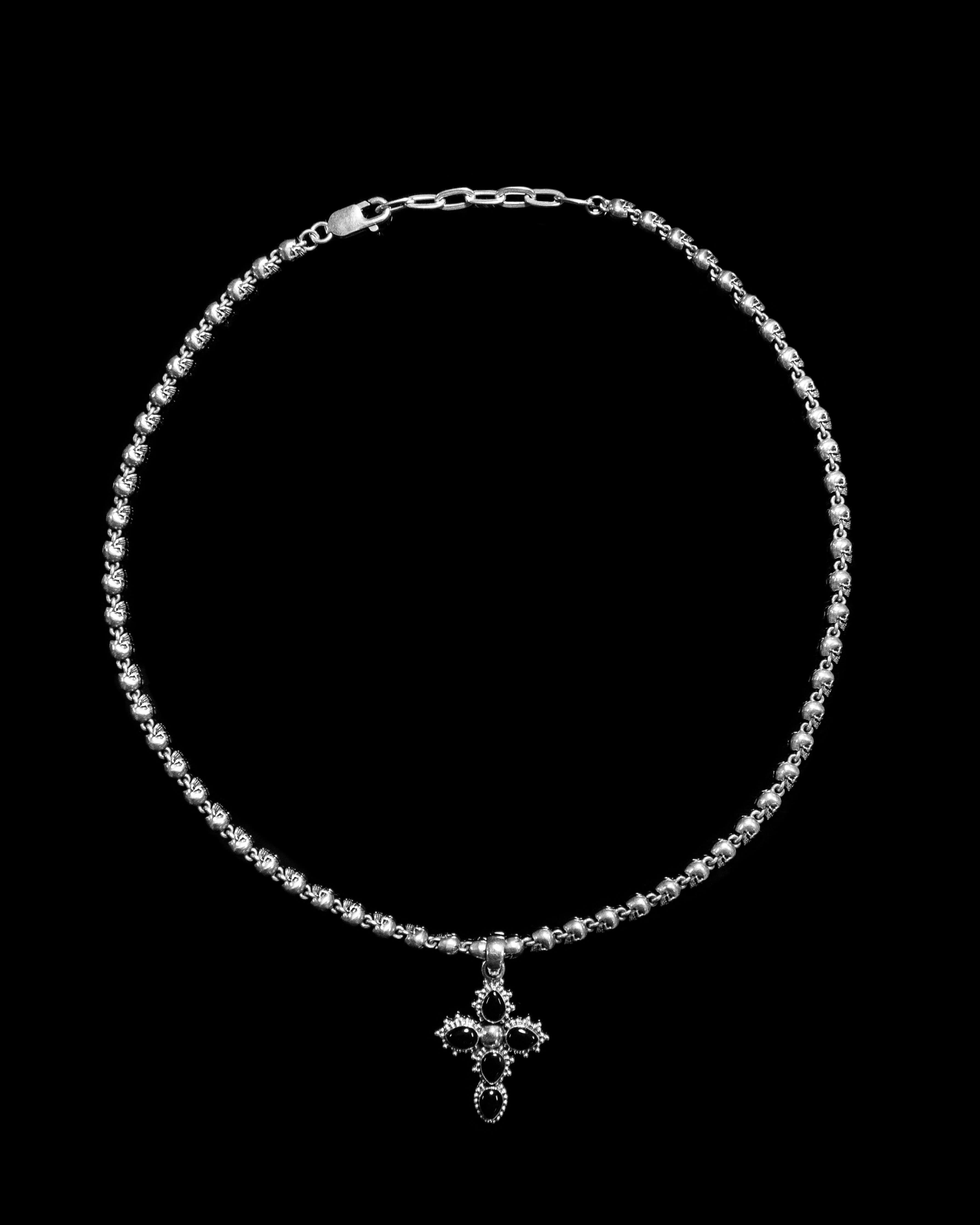 The Repent Charm Necklace is the ultimate statement of refined craftsmanship and timeless design. Combining our iconic Repent Charm with the intricately designed Skull Link Chain, this piece is crafted from solid 925 sterling silver for unmatched quality and durability. The charm features four hand-cut and shaped onyx stones, forming a striking cross that symbolizes strength and conviction. Suspended from a highly detailed chain made up of 62 mini skulls, this necklace is as raw as it is refined. Adjustable from 18.5" to 20.5", it offers a custom fit for any style. As our best-selling necklace, the Repent Charm Necklace is a staple in any collection, built to command attention and stand the test of time.