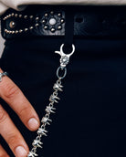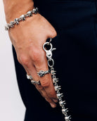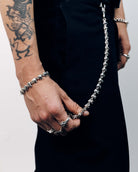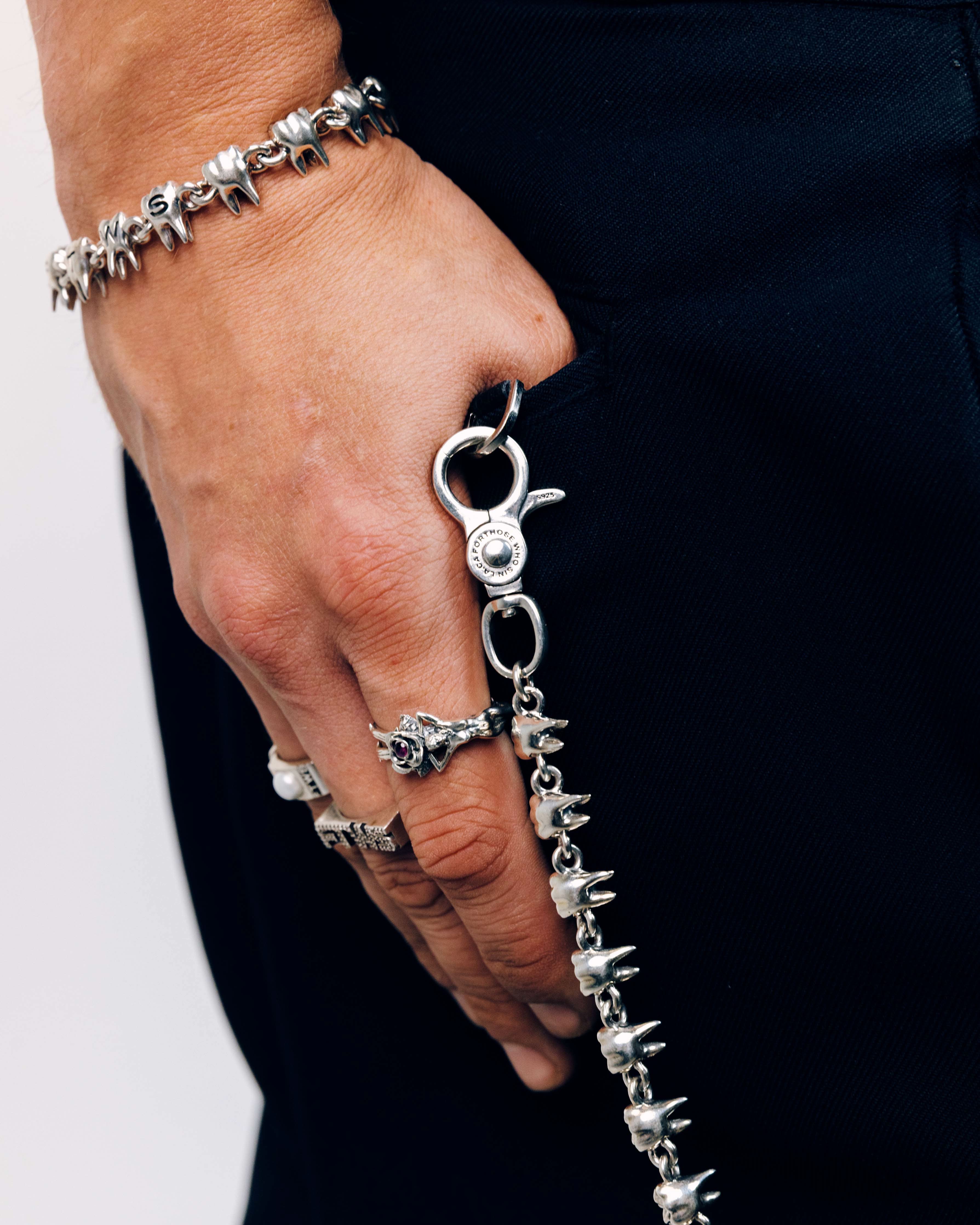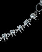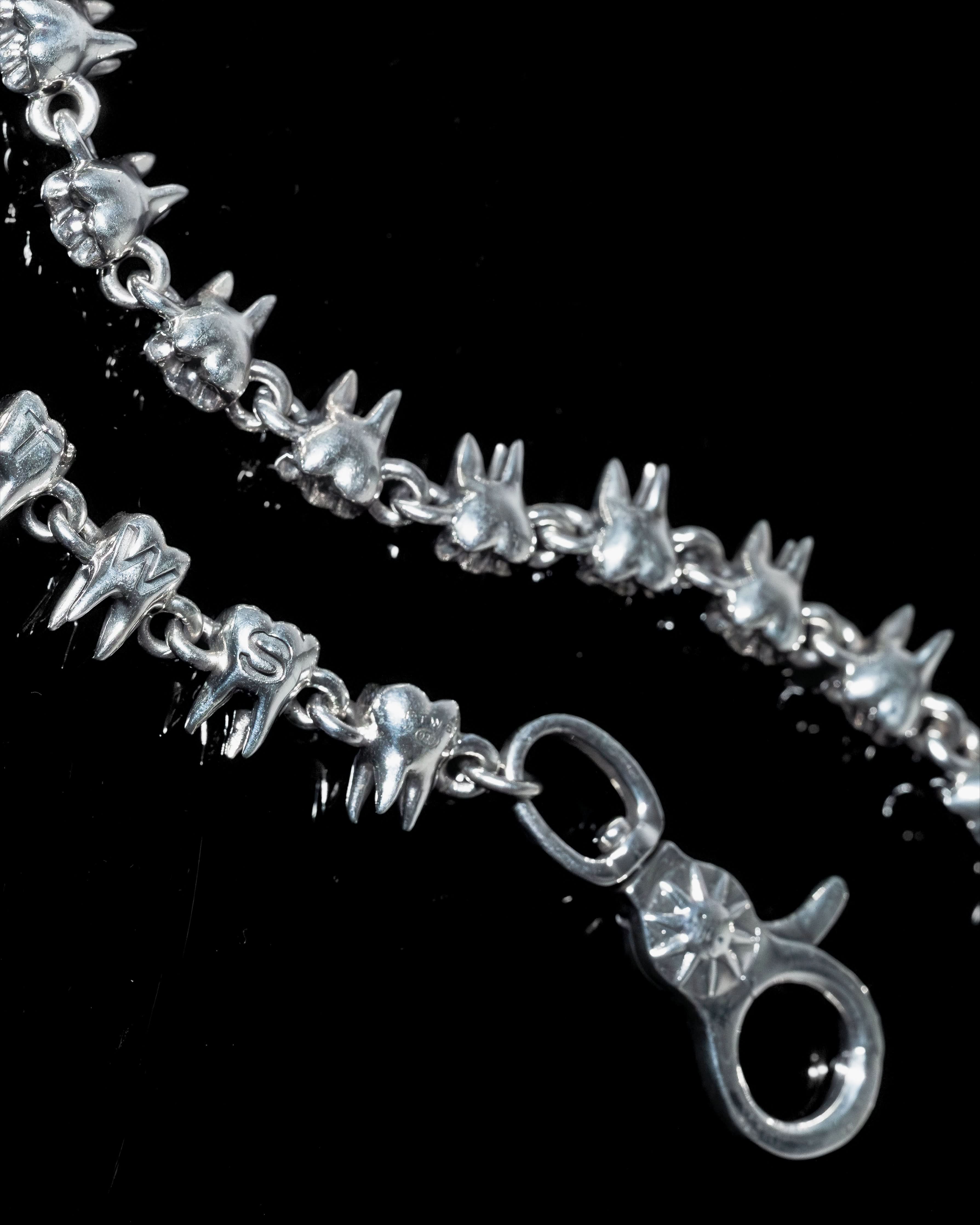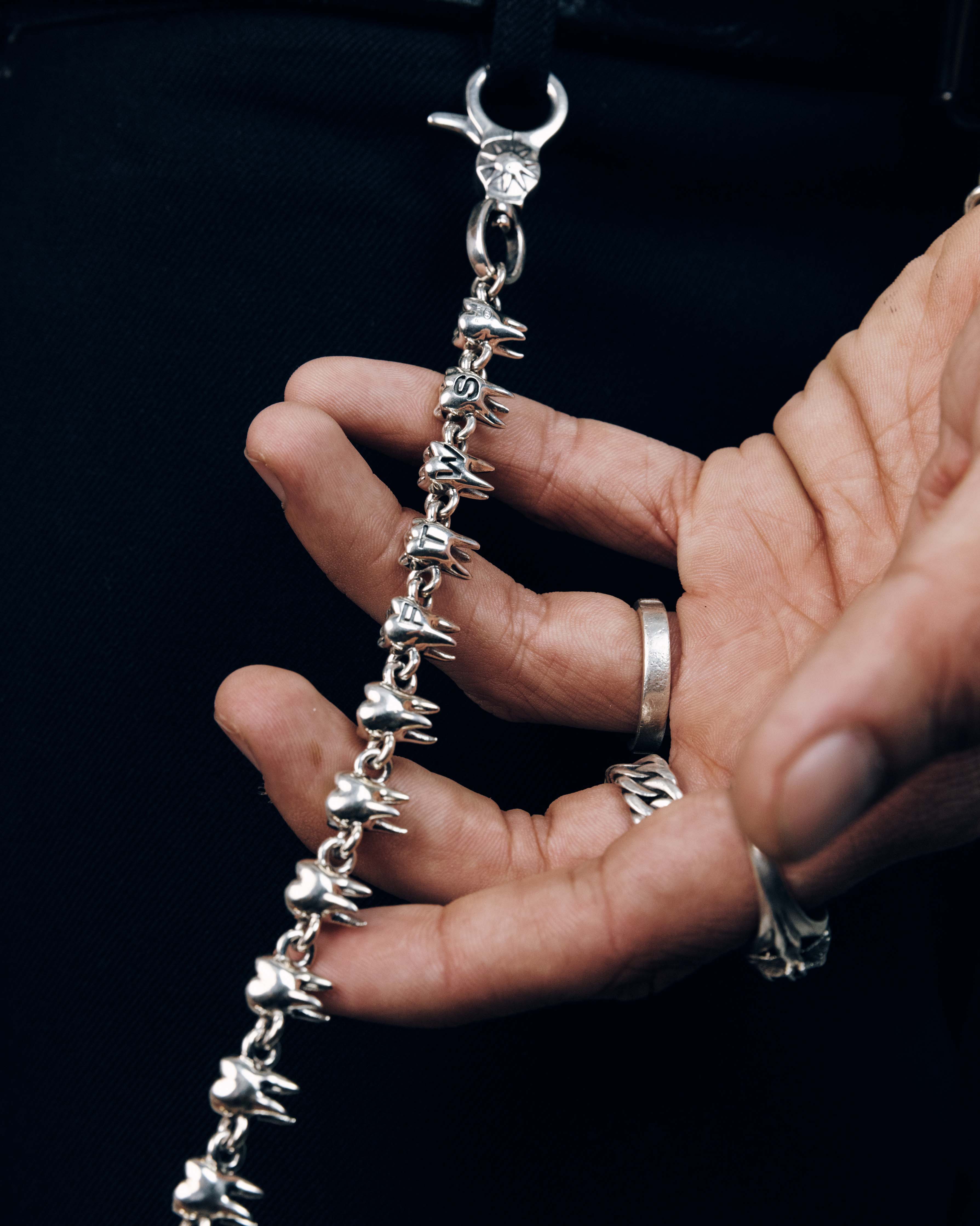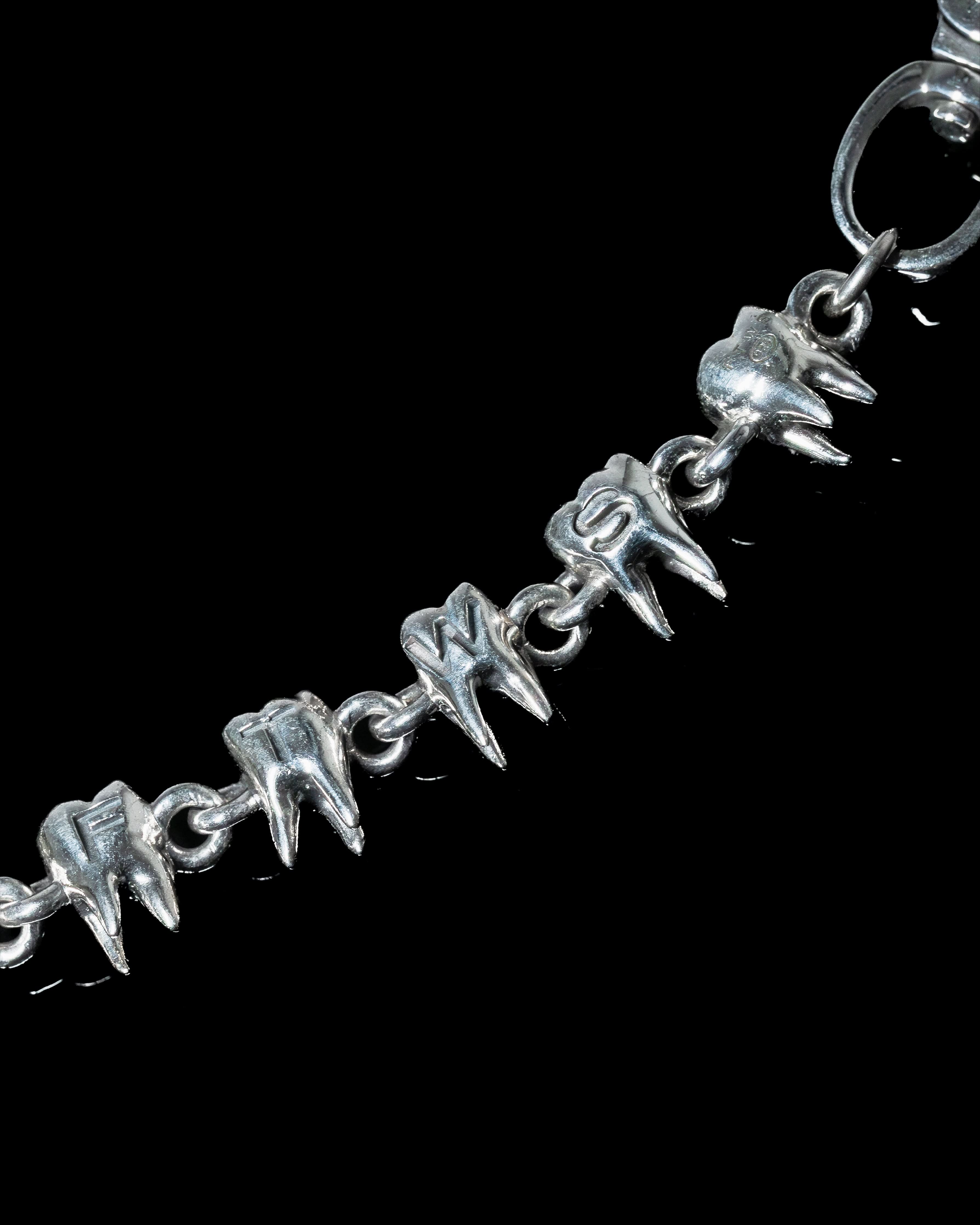 The Crooked Smile Wallet Chain is a meticulously crafted piece of functional jewelry, made entirely from solid 925 sterling silver. Featuring 35 hand-cast molar teeth and custom FTWS-branded swivel clips sourced from Italy, every element is built with care, precision, and intention. At 22 inches in length and weighing over 150 grams, this chain carries a substantial feel without compromising on craftsmanship. Designed to last a lifetime, it’s a testament to the artistry and detail that define every FTWS piece.