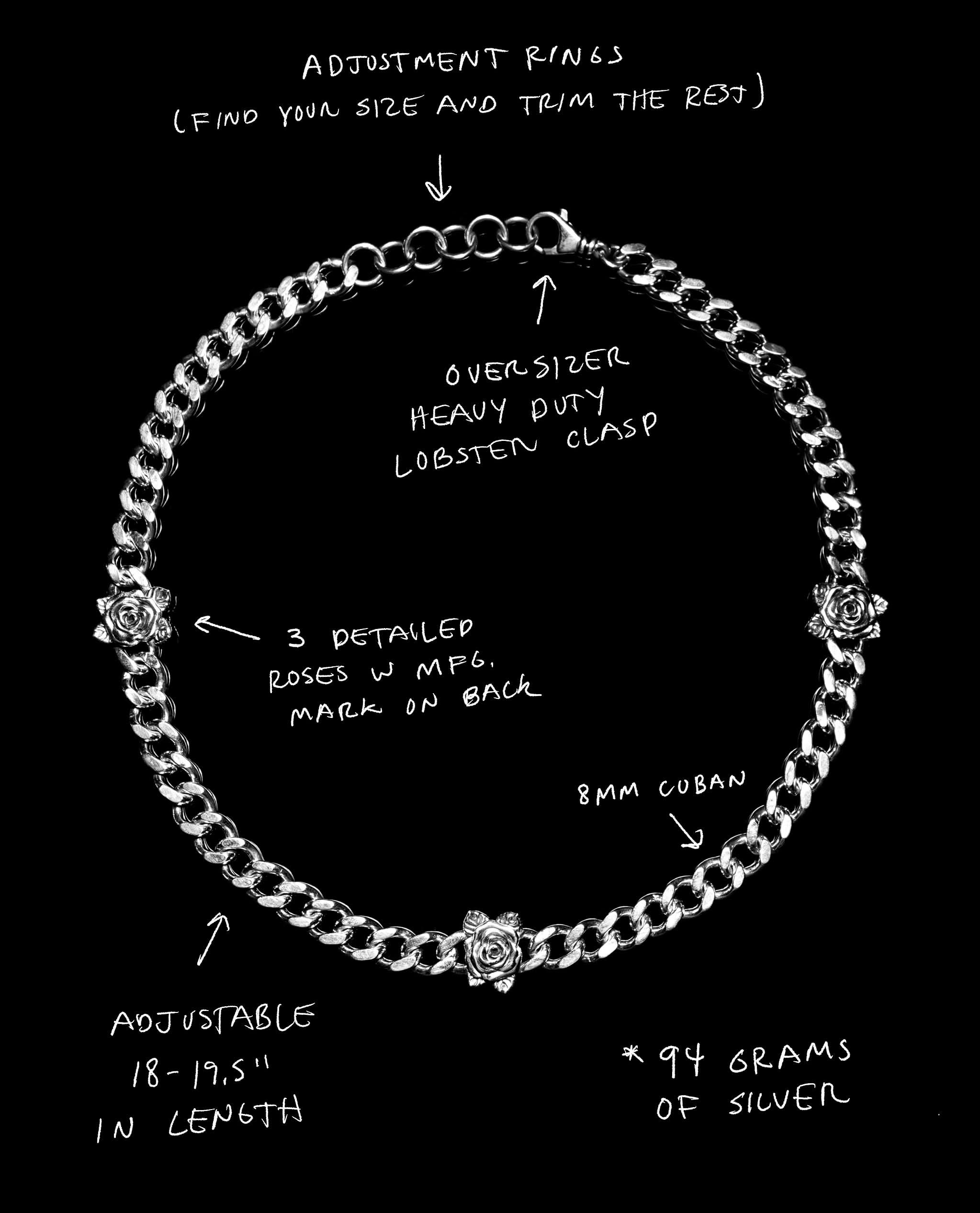 Introducing the Rose Cuban Necklace. A masterful blend of timeless elegance and contemporary design. Crafted from solid 925 sterling silver, this unisex necklace boasts an adjustable 18-19.5" length, making it a versatile accessory for any wardrobe. Weighing an impressive 94g, its substantial feel speaks to its exceptional quality. Designed in Los Angeles and meticulously developed in Thailand, this piece reflects our commitment to expert craftsmanship and global artistry. Combining bold style with luxury at an accessible price, the Rose Cuban Necklace is a statement of sophistication built to elevate your look.
