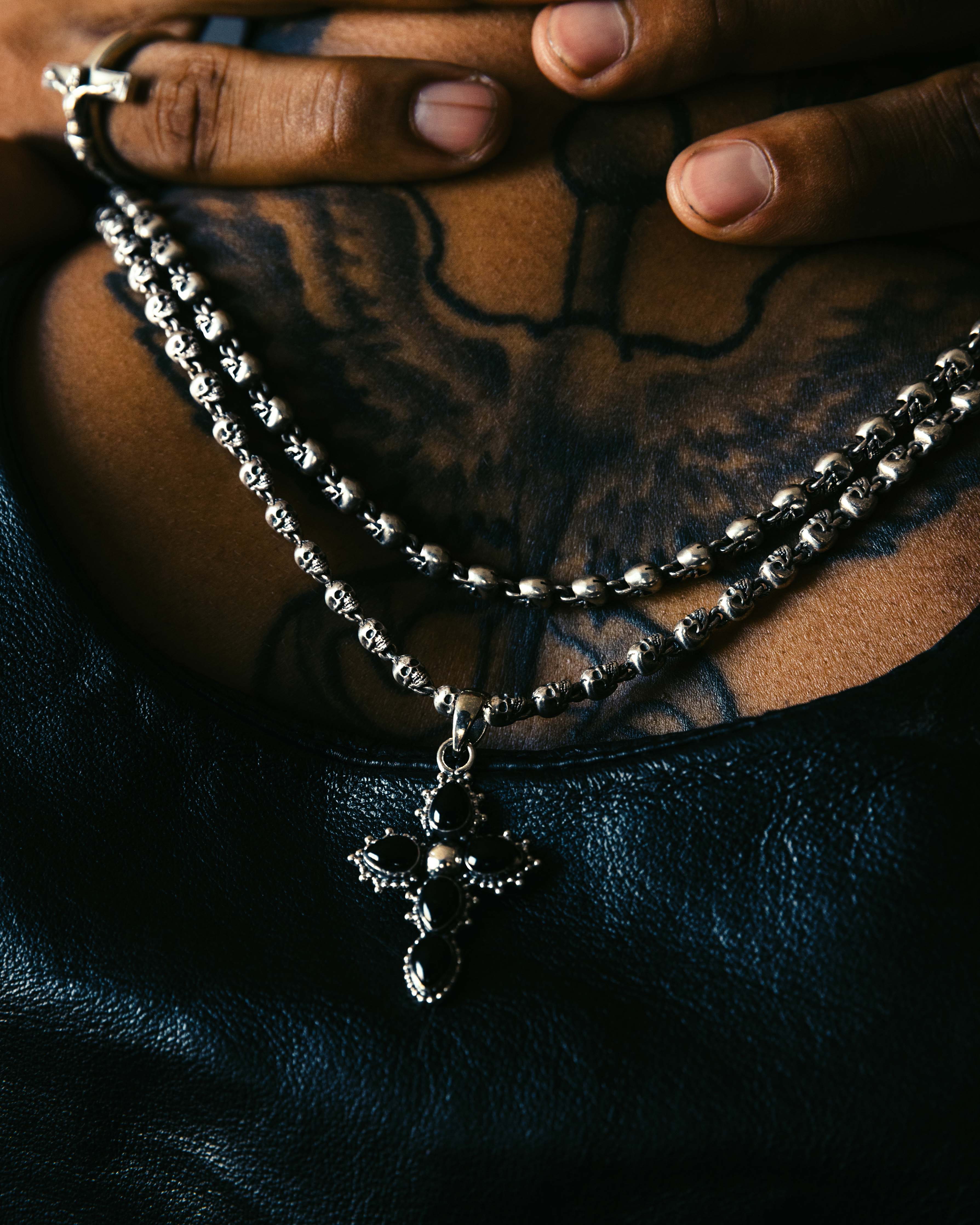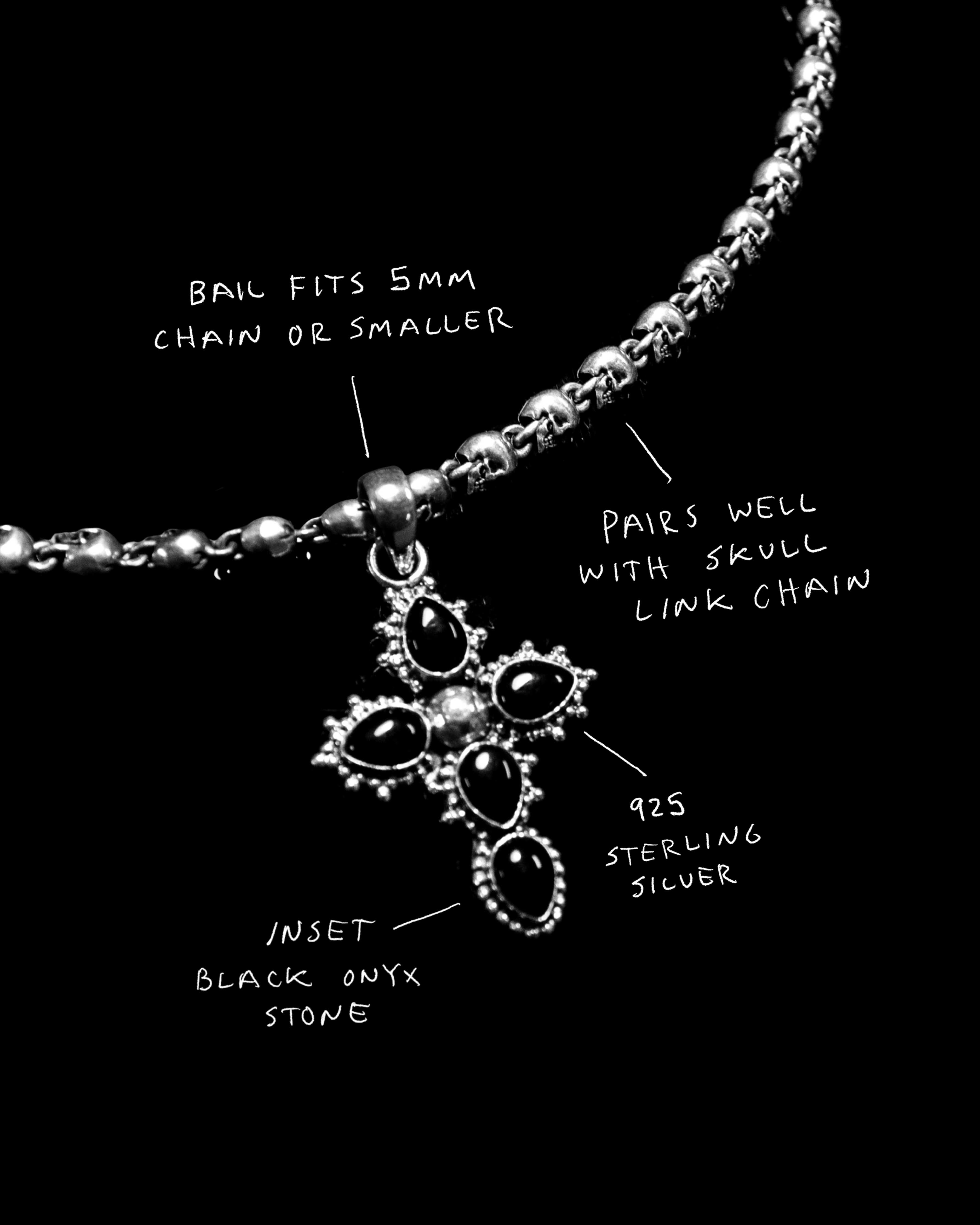 The Repent Charm is a bold symbol of craftsmanship and meaning, meticulously designed in solid 925 sterling silver. Featuring four hand-cut and shaped onyx stones, it forms a striking cross, embodying both edge and elegance. Every detail is carefully sculpted, creating a piece that stands out whether worn alone or as part of a layered look. Pair it with a chain of your choice, or opt for the full statement with our Skull Link Chain, available as the Repent Charm Necklace. Built to last and designed to be worn daily, this piece is a reminder, a statement, and an icon all in one.