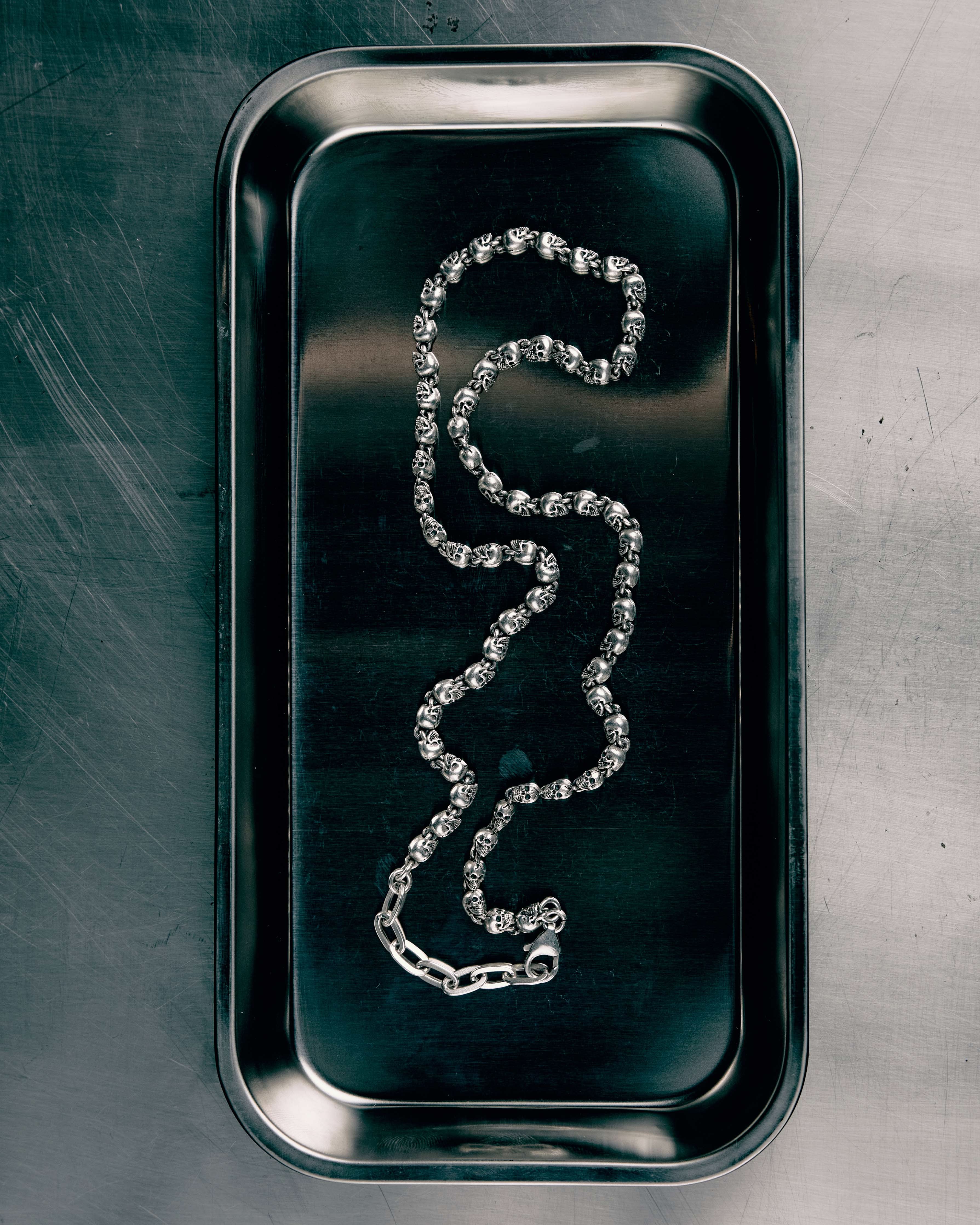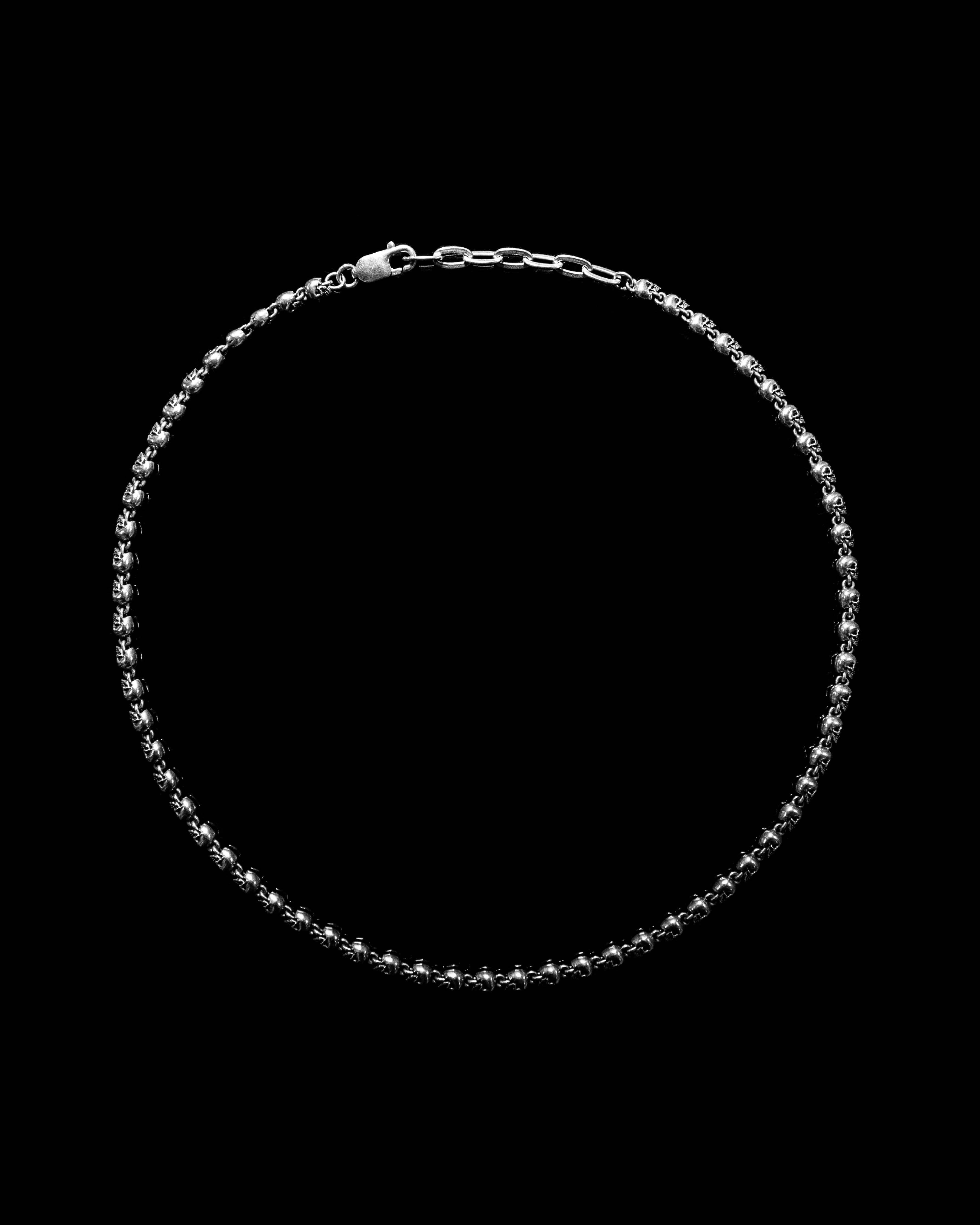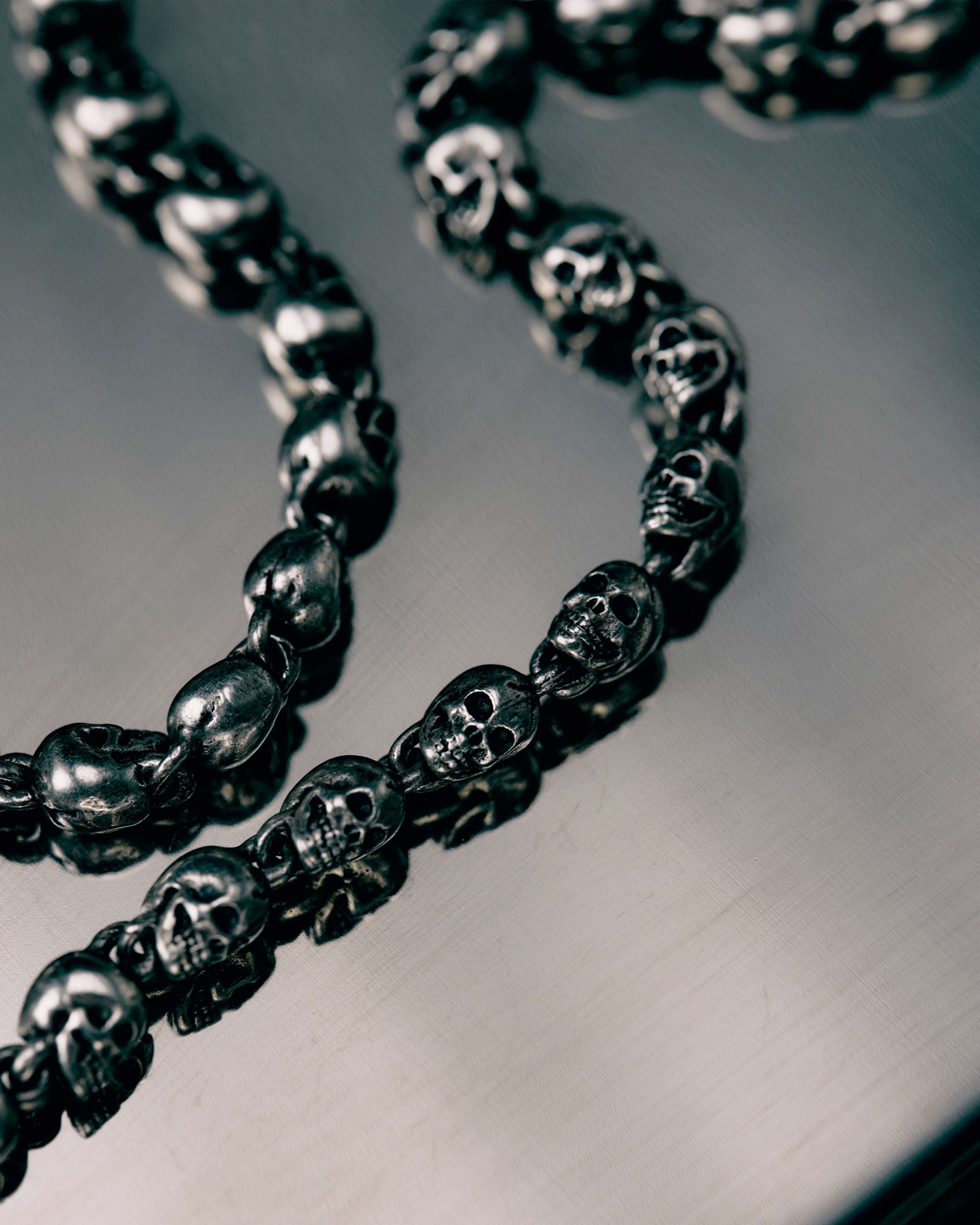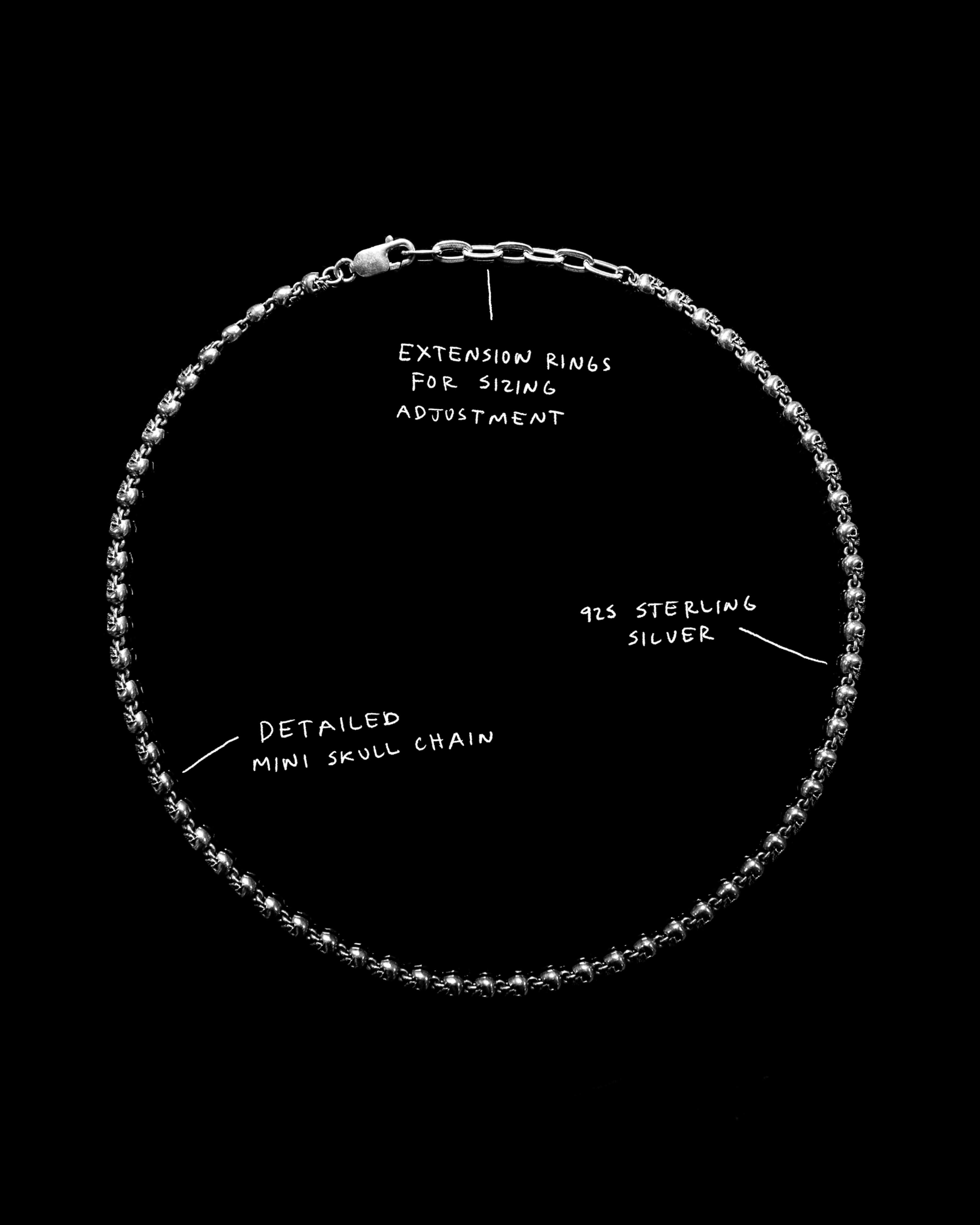 The Skull Chain Necklace is a masterful blend of beautifully subtle design and bold craftsmanship. Crafted from 925 sterling silver, this highly detailed chain features 62 mini skulls meticulously linked together to create a piece that makes an unforgettable statement. Adjustable from 18.5" to 20.5" Its understated design whispers at first glance, but upon closer inspection, the intricate craftsmanship and unique skull detailing become undeniable. Perfect for those who appreciate fine detail with an edge, the Skull Chain Necklace is a versatile piece that makes an impactful addition to any collection.